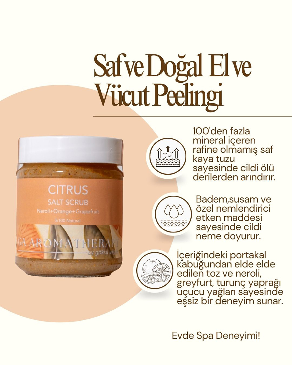 100’den fazla mineral içeren rafine olmamış saf kaya tuzu sayesinde cildi ölü derilerden arındırır. Badem,susam ve özel nemlendirici etken maddesi sayesinde cildi neme doyurur. İçeriğindeki portakal kabuğundan elde elde edilen toz ve neroli, greyfurt, turunç yaprağı uçucu yağları sayesinde eşsiz bir deneyim sunar.